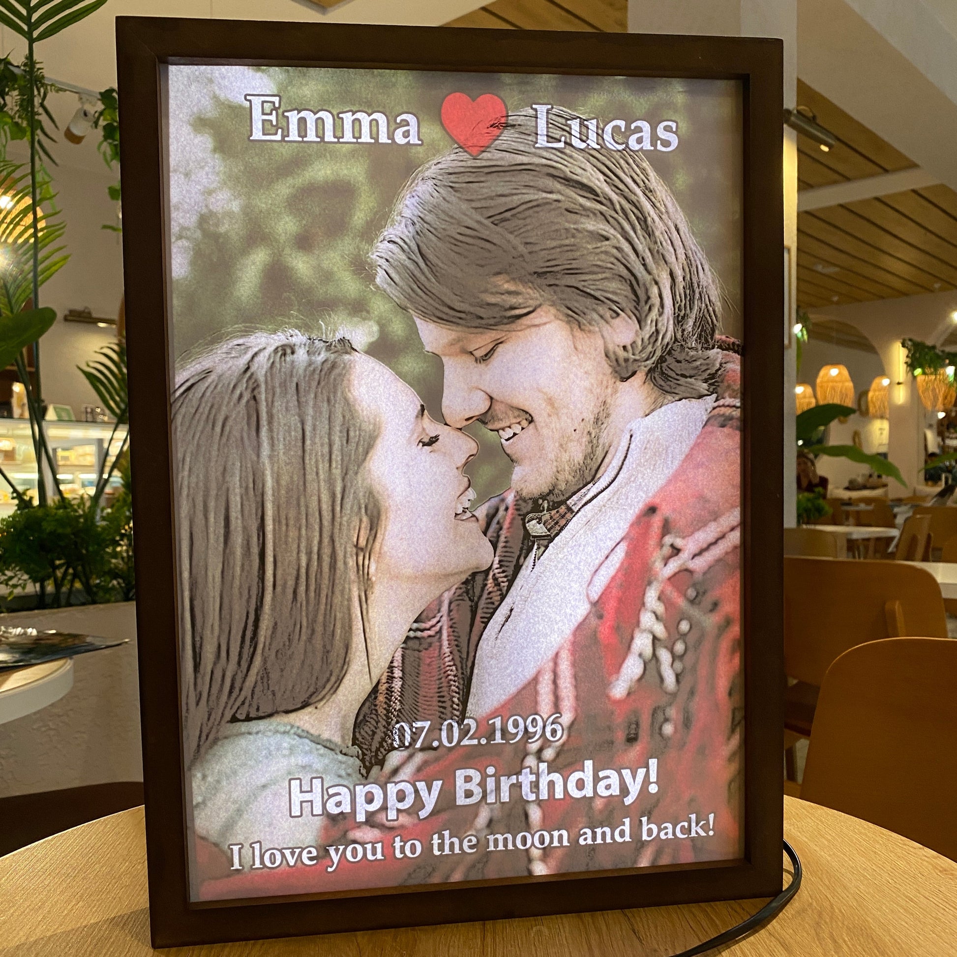 When it’s off, your photo appears as an elegant black-and-white line drawing—calm, minimalist, gallery-worthy. Tap the discreet button on the top of the frame and the piece softly lights up, revealing a vivid, full-color image with your custom text (names, dates, quotes, or a short message). It’s a quiet transformation that never gets old—kids gasp, friends smile, and loved ones feel seen.